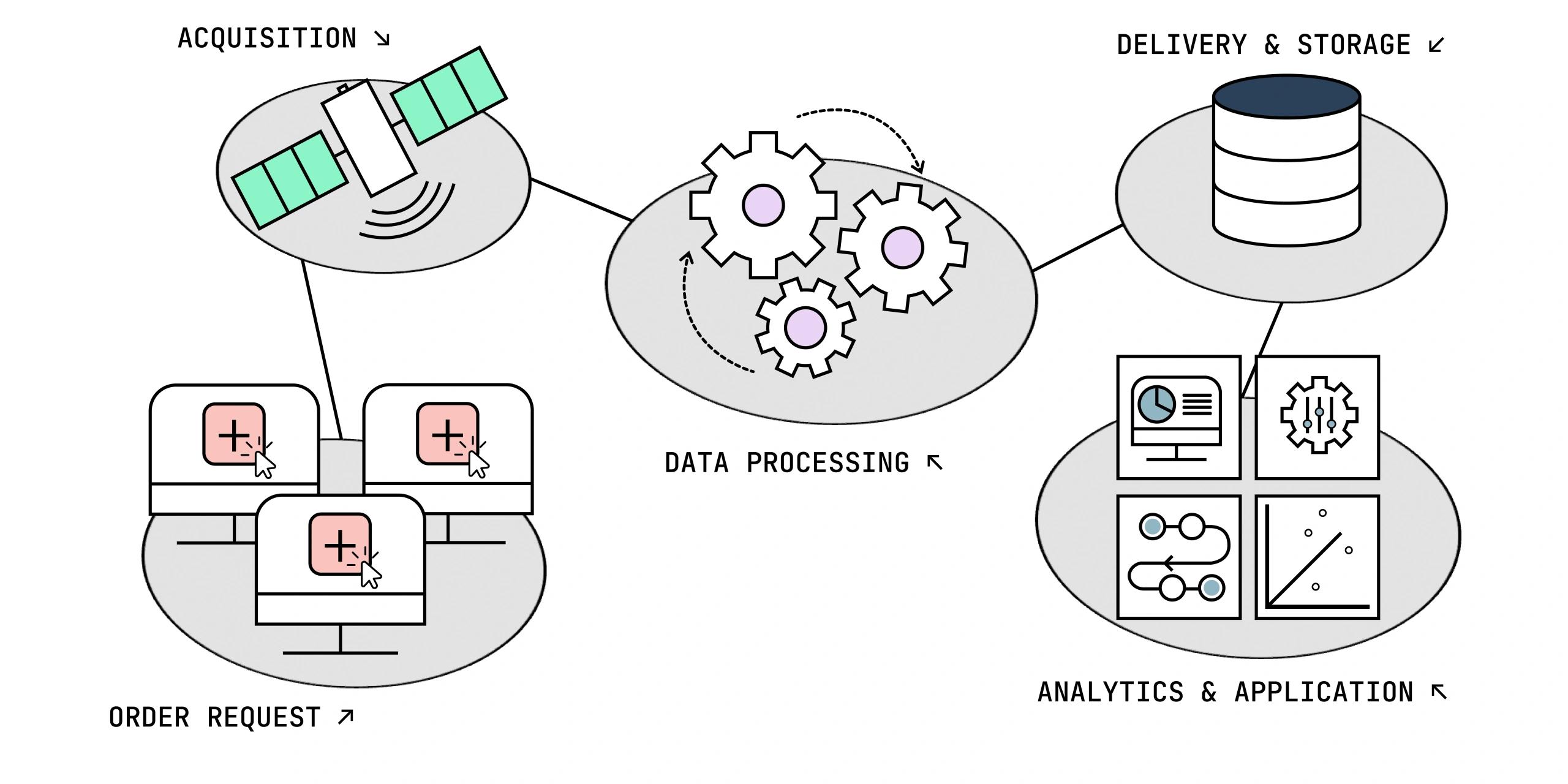 - The satellite beams data to ground stations where it’s stored and queued for initial QC and processing.